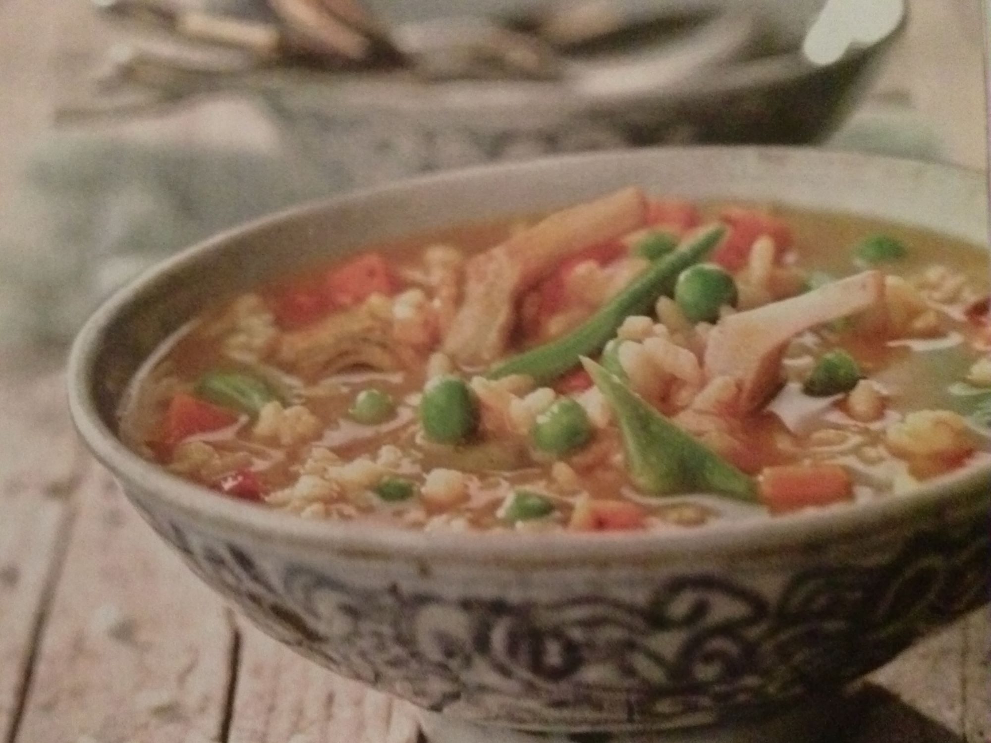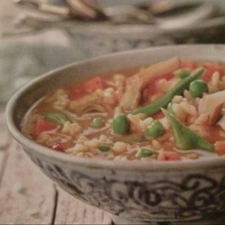 Sazona, remueve y baña con el agua muy caliente. Deja cocer durante 13 minutos, incorpora las judías verdes y los guisantes y cuece 5-6 minutos más.