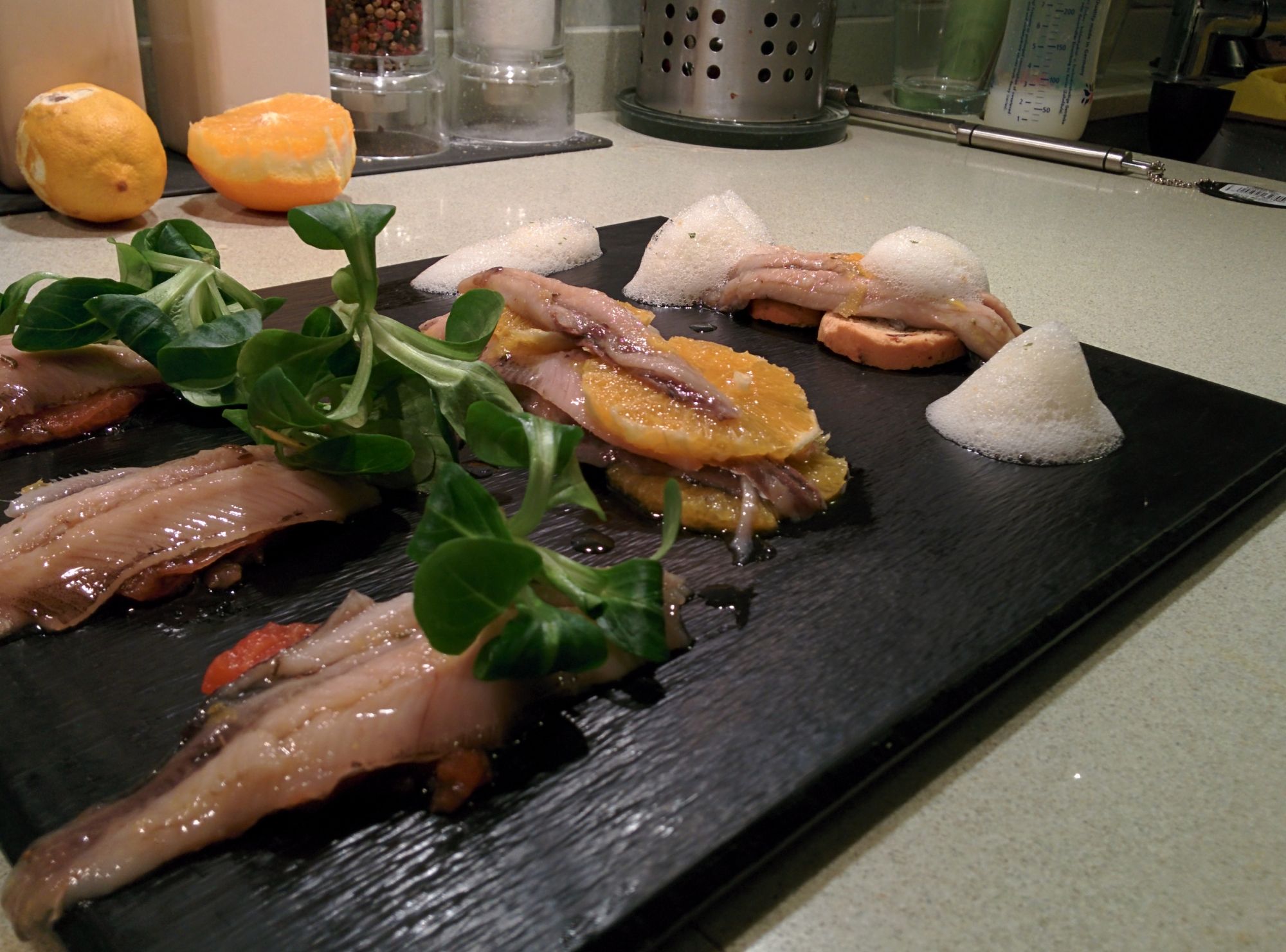 Bueno ya casi hemos terminado, falta preparar el emplatado, en este caso he presentado 3 variedades, 1º con tomate y canónigos, 2º mil hojas de naranja 3º con aire de almejas.
