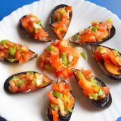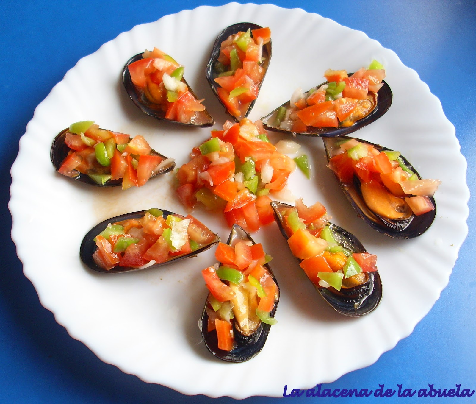 Abrimos los mejillones, y separamos para desechar concha vacía, colocamos la otra con su mejillón hacia arriba, en una bandeja, cuando estén todos colocados, le vamos poniendo encima de cada uno de ellos, ayundándonos con una cuchara, el picadillo a la vinagreta que teníamos