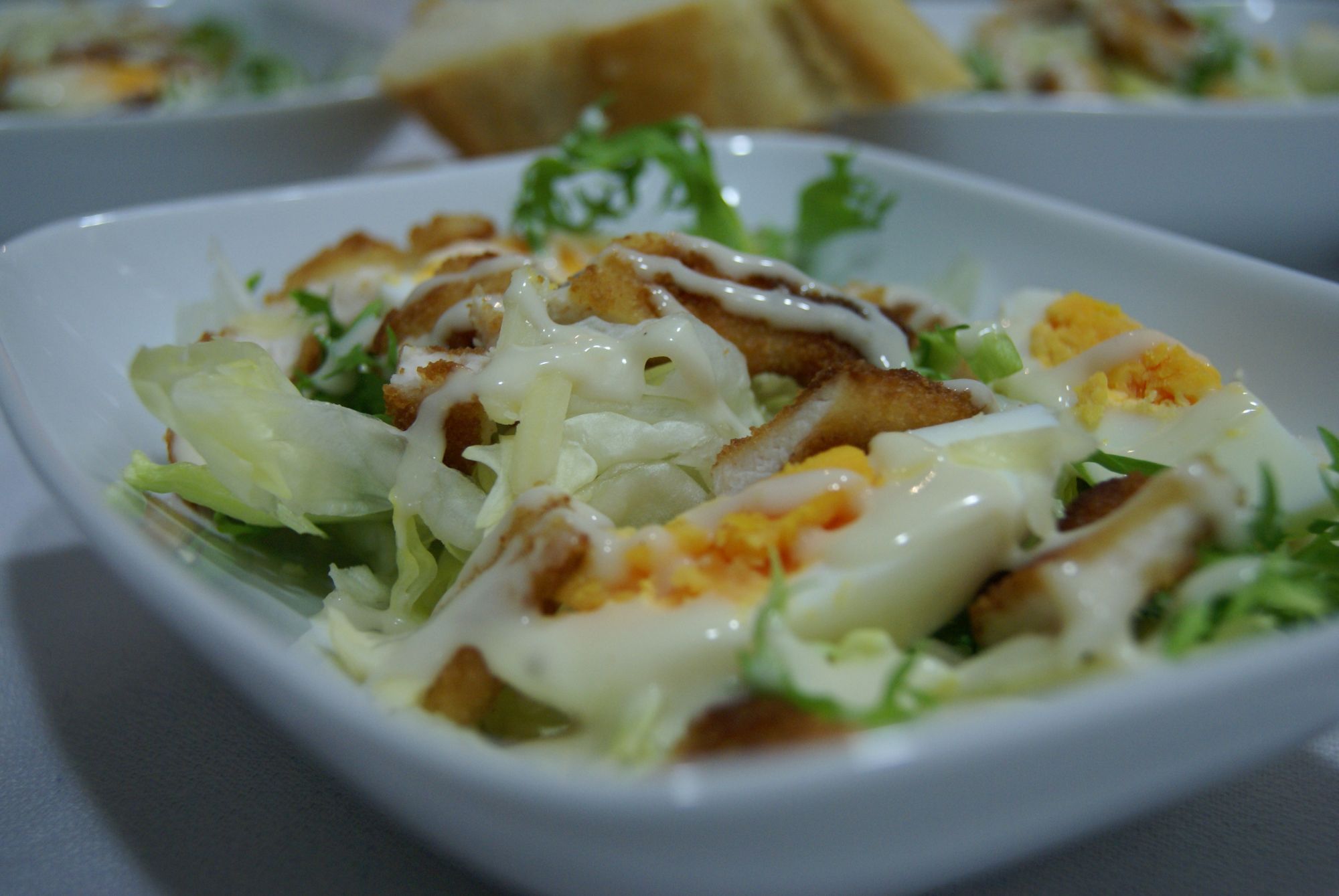 Para el montaje; ponemos las lechugas, y añadimos el huevo cocido, la pechuga de pollo empanada, el queso y por ultimo la salsa cesar.