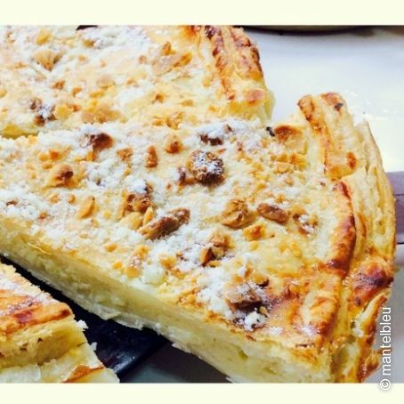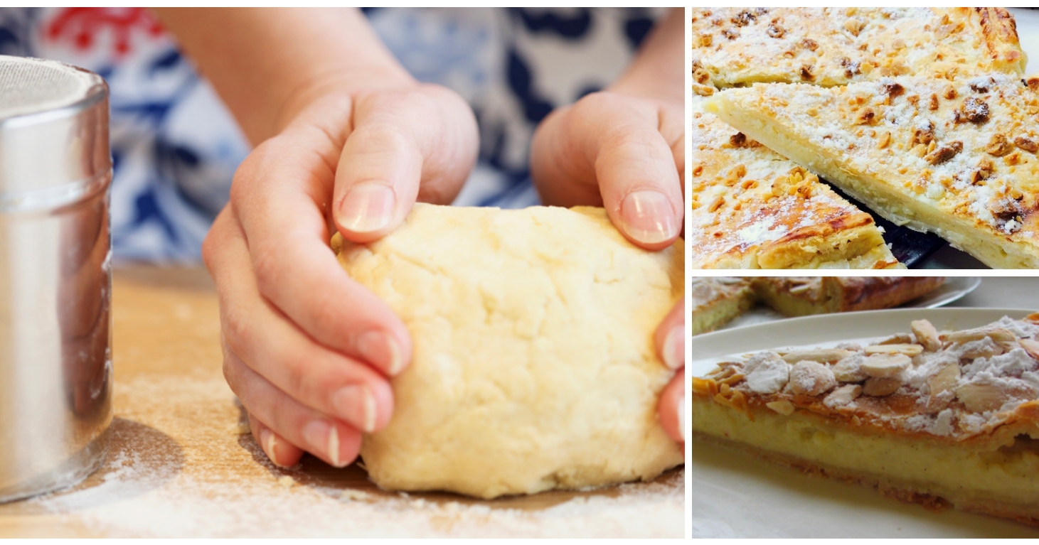 Hoy probamos con un pastel clásico de Euskadi, cuyo origen es italo-francés según cuentan los paladares más doctos. Consta de una base y una tapa de hojaldre, con un relleno de crema pastelera y luego a la tapa la sembramos con almendra blanca que se nos tuesta mientras crece el hojaldre en el horno.