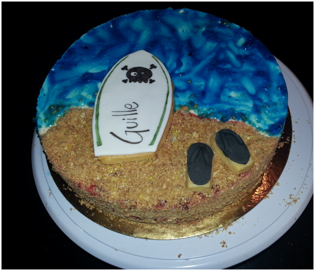 Al día siguiente trituramos unas poquitas galletas más, cubrimos una parte de tarta con un poco de mermelada y le ponemos encima las galletas trituradas que harán de arena!
