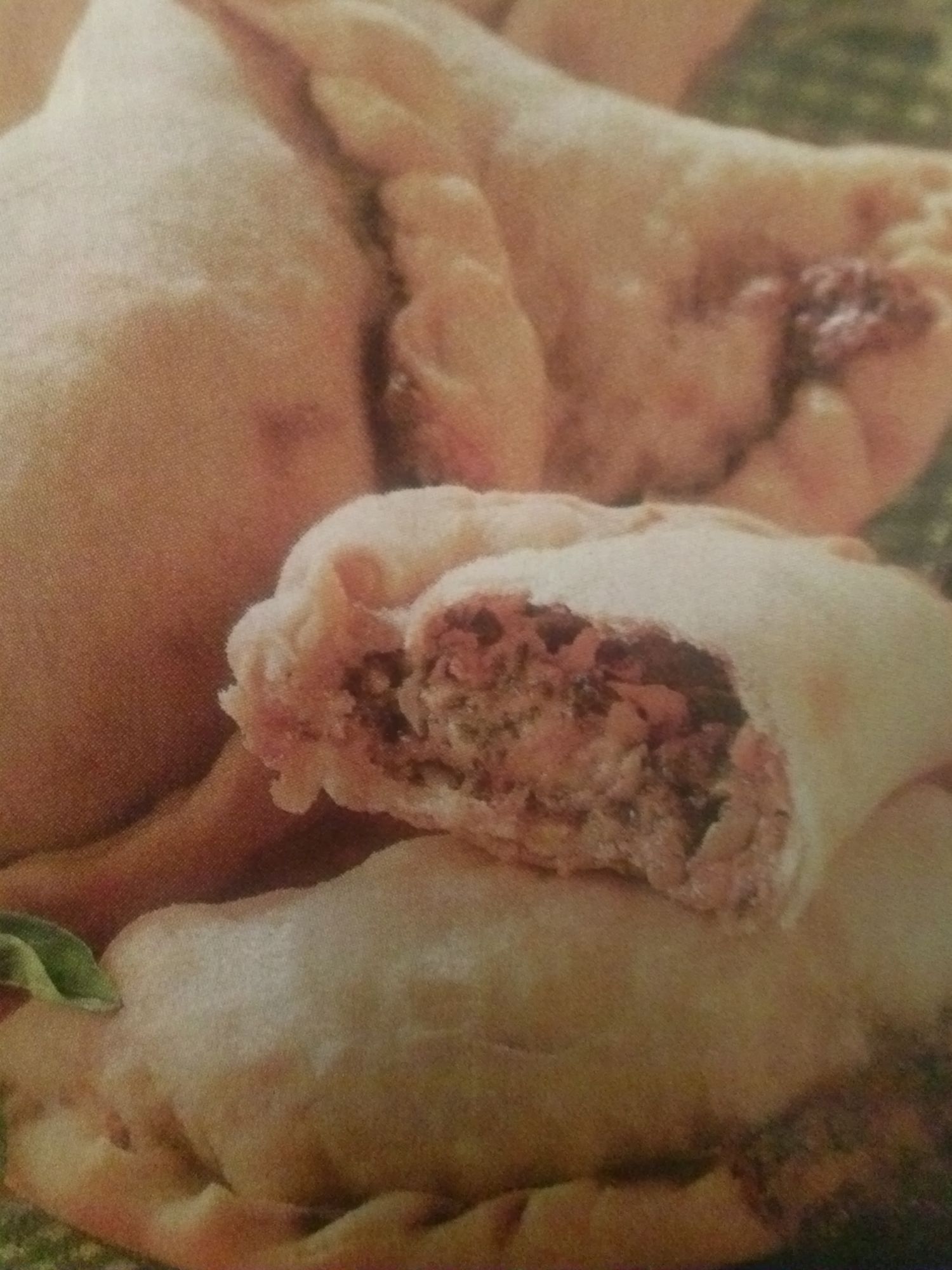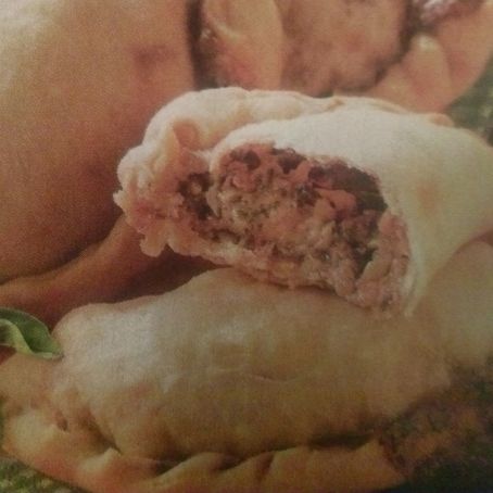 Precalienta el horno a 220º. Divide la masa en ocho partes, estíralas con el rodillo sobre la mensa enharinada y dales forma de disco. Reparte en un lado el relleno y dóblalos; humedece los bordes con agua y séllalos, doblándolos para darles forma de cordón.