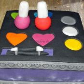 Si te gusta decorar tartas con fondant porqué no probar con esta en forma de estuche de maquillaje... La base es un bizcocho de chocolate y el resultado fantástico.