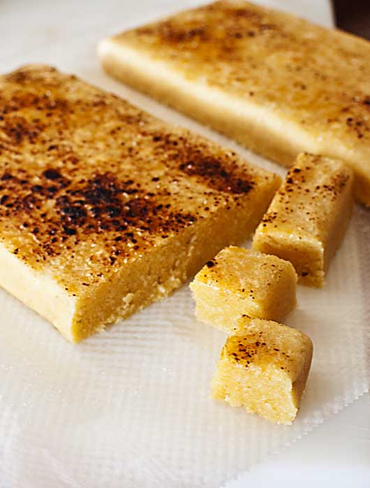 Pasado este tiempo, desmoldar el turrón conservando el papel inferior, mezclar una yema con dos cucharadas colmadas de azúcar, mezclar bien y cubrir con esta pasta la superficie del turrón, espolvorear con un poco más de azúcar y quemar toda la superficie con un soplete o quemador de cocina procurando que toda la crema quede bien quemada.