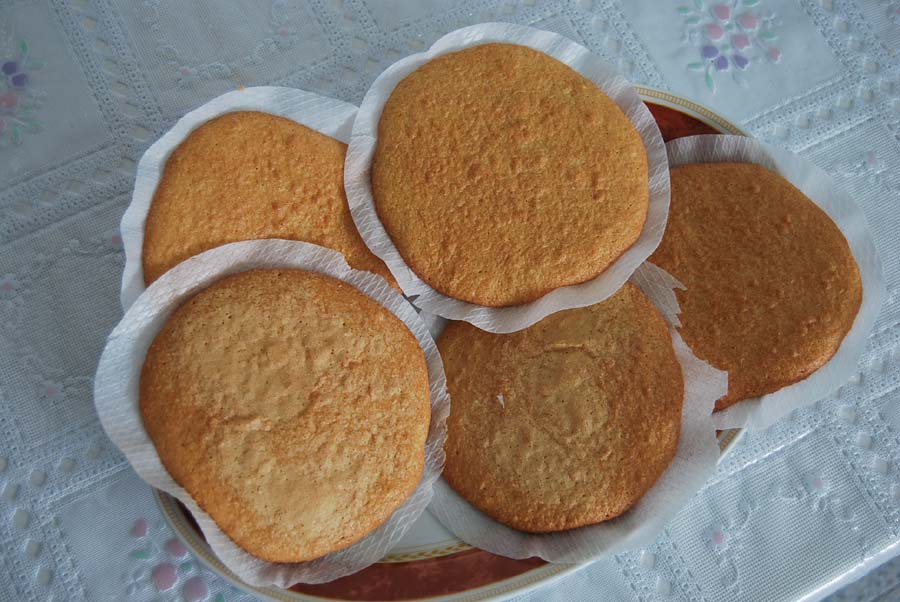 Sobre cada papel de neula poner una torta en forma de circulo y espolvorear con canela.