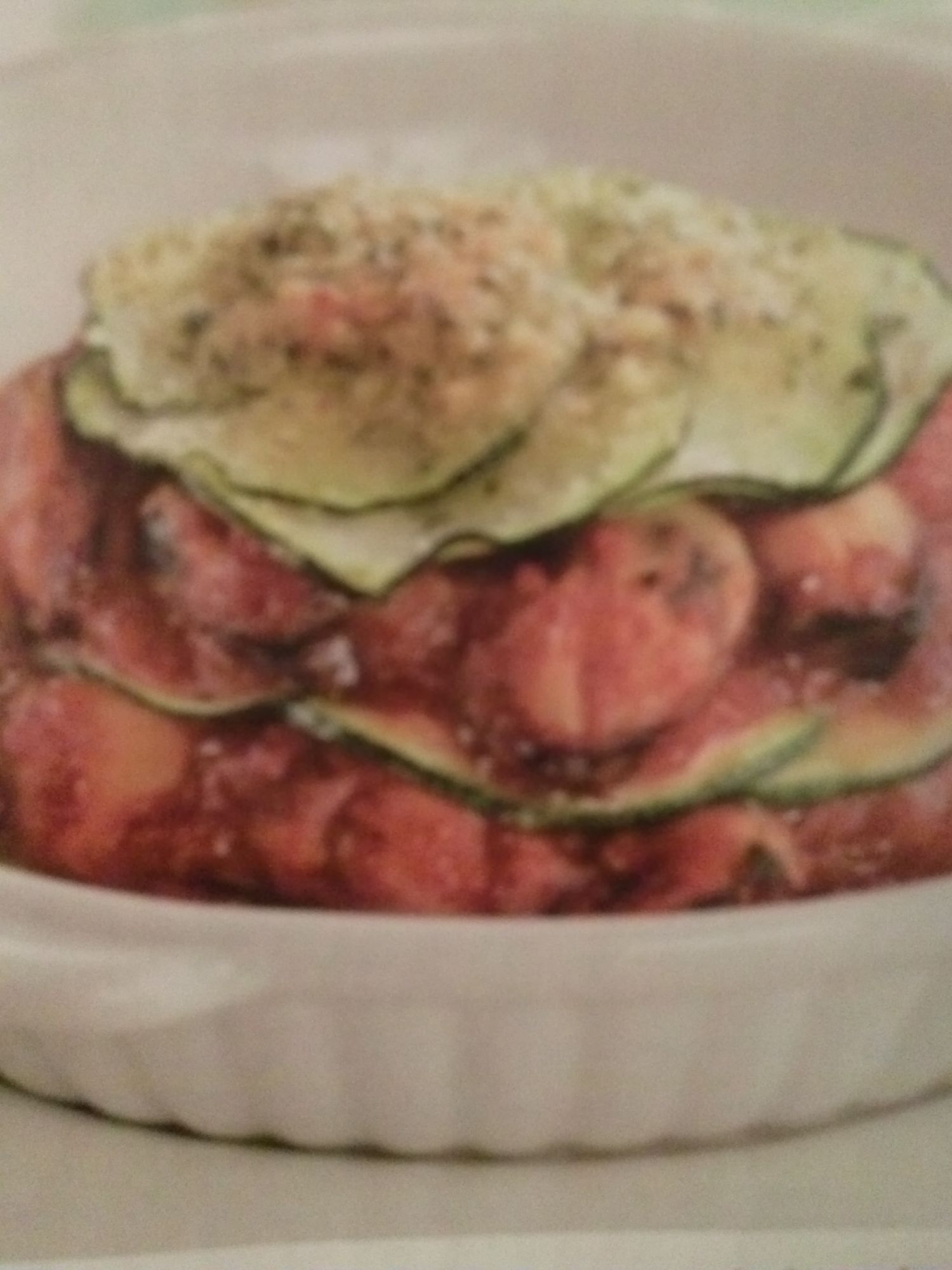 Ve alternado capas de calabacin y de sofrito con los mejillones en cazuelitas individuales o en una fuente.