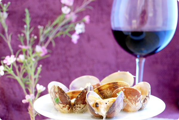 4.- Pon el agua, vino, el chorro de limón, la sal y el tomate. Pon el cestillo con las almejas dentro del vaso y espolvorea el perejil picado. Cierra el vaso y programa 15-20 minutos, Varoma, velocidad 2. Si no estuvieran abiertas las almejas al terminar, programa unos minutos más. Listo