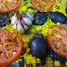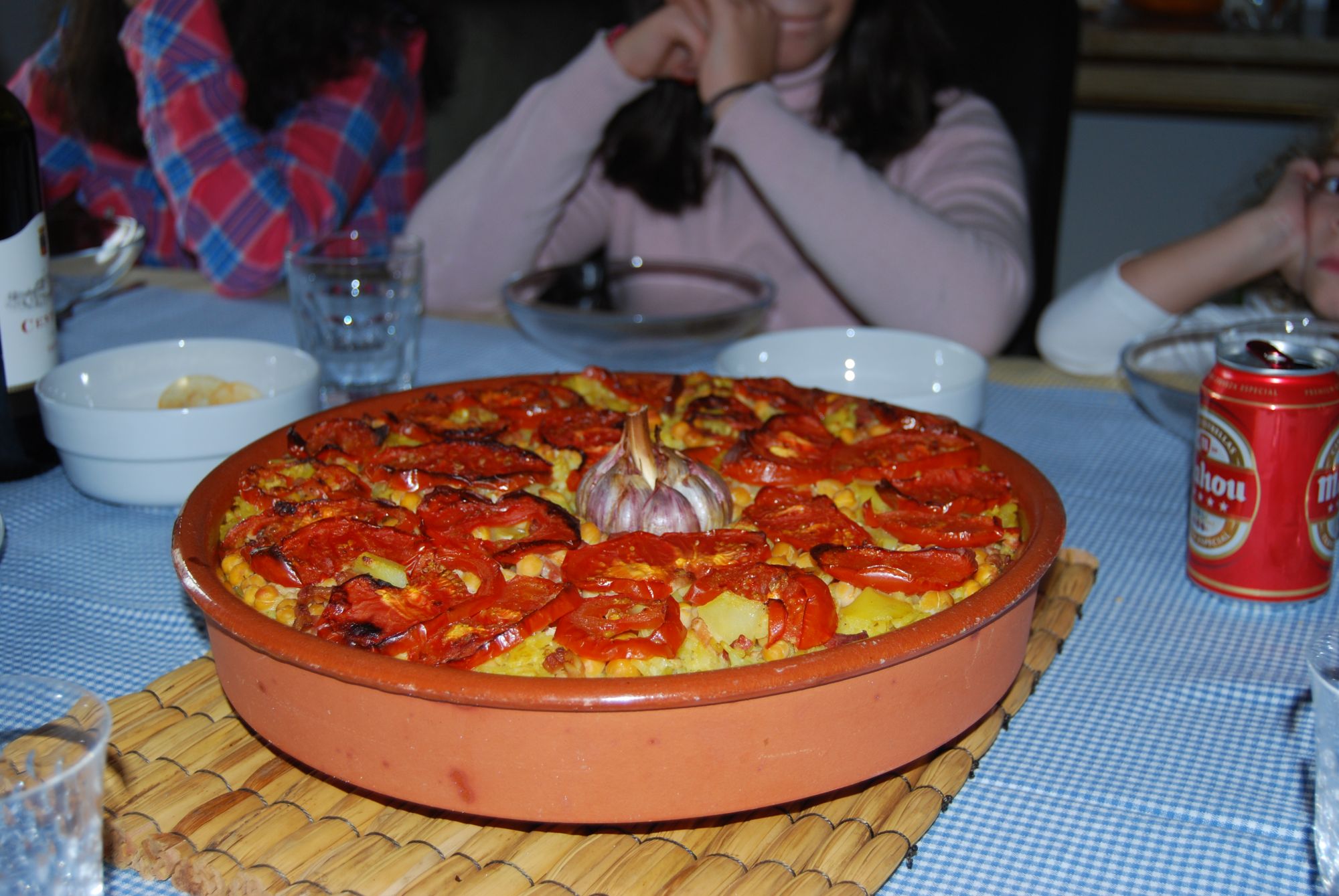 se mete en una fuente de barro y se adorna con rodajas de tomate y una cabeza de ajos en el centro.
