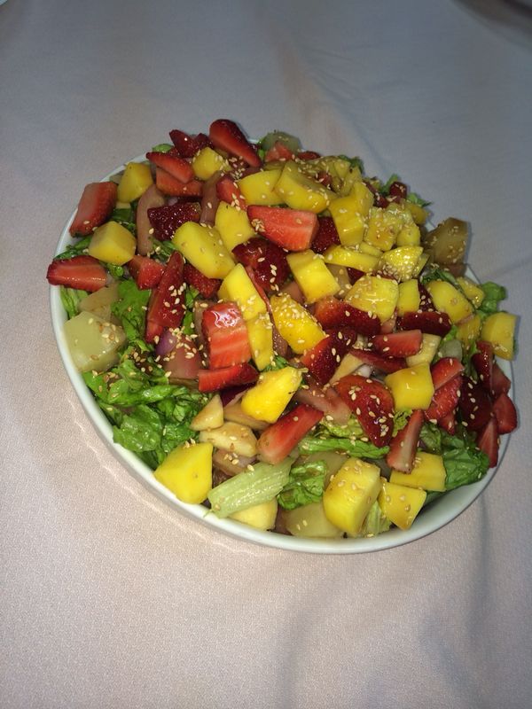 • Antes de servir añadimos la vinagreta de la fruta elegida mezclada con la miel y el sésamo