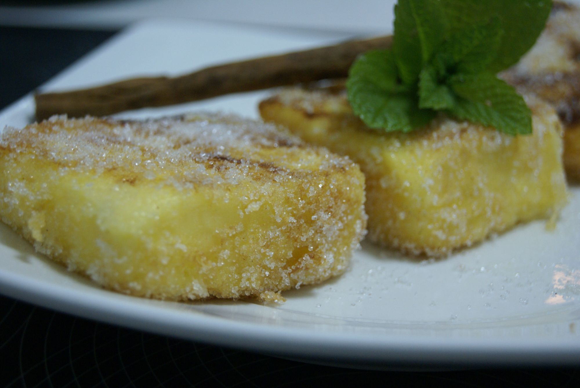 Una vez fría la crema, cortar cuadrados del tamaño deseado, pasarlos primero por harina y luego huevo batido y freír en abundante aceite de oliva caliente.