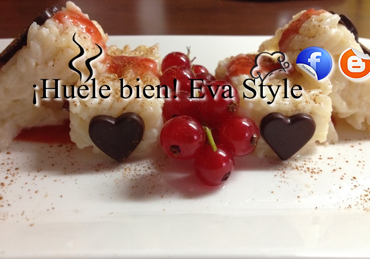 Arroz con leche, transformados en unos bloques. Servidos con una salsa caliente de fresa, unas grosellas, corazones de chocolate para decorar y rociado con canela en polvo.