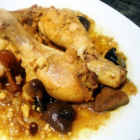Pon en una cazuela los muslitos y el sofrito, los piñones, las setas y las alcachofas cortadas en cuatro trozos.