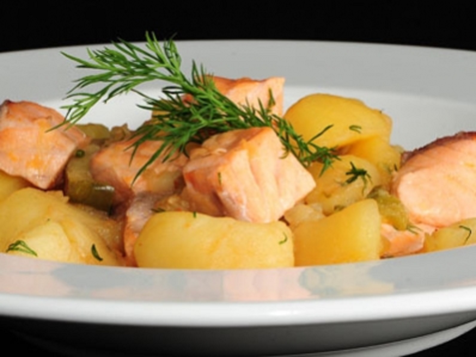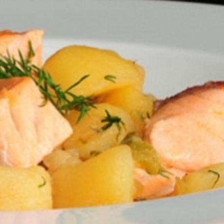 Lava el salmón, sécalo y salppiméntalo ligeramente. Añádelo a la cazuela, con las almendras picadas. Tapa, deja cocer 3-4 minutos y sirve enseguida.
