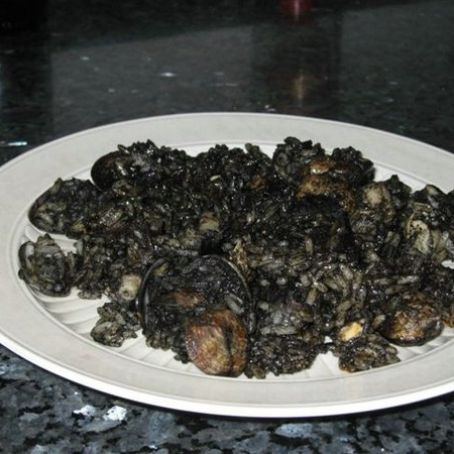 En un cazo poner a calentar el caldo que vamos a utilizar.Calentar el aceite en una cazuela y rehogar a fuego vivo los calamares durante unos minutos, cuando estén dorados sácalos a un plato con una espumadera intentando que quede el máximo aceite en la cazuela, añadir la cebolla y rehogar hasta que esté transparente. Agregar los tomates y sofreír durante 4 minutos.Ahora añade el arroz y la tinta de calamar. Mezcla bien con las verduras durante 1 minuto y añade el caldo bien caliente.