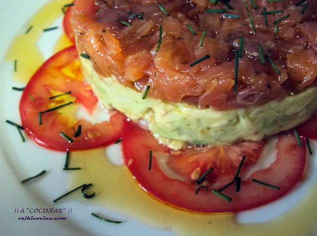 Ya sólo nos queda emplatarlo, poniendo unas finas rodajas de tomate..., y con ayuda de un aro si tienes, primero la base de aguacate, y a continuación el salmón.