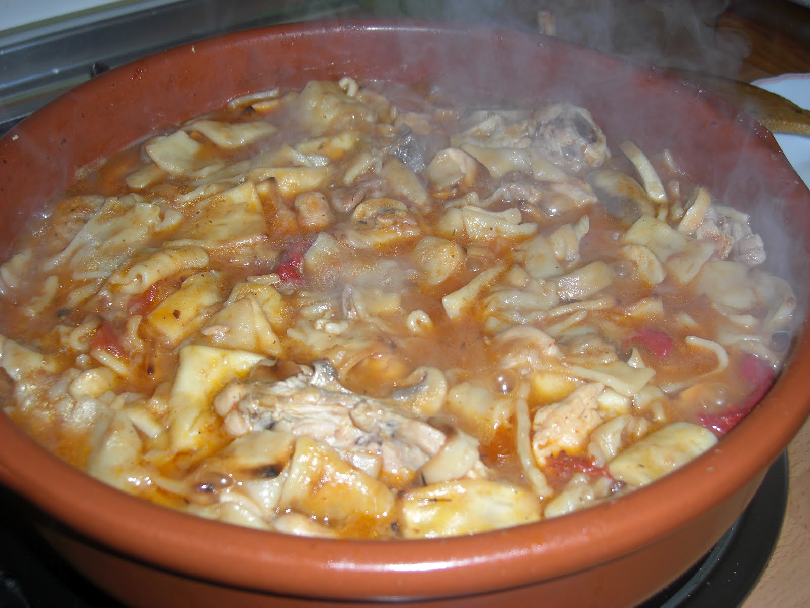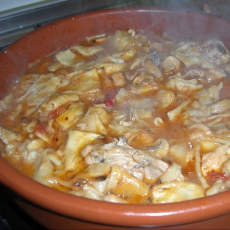 Cuando pasen 10 minutos, añadimos agua, hasta cubrir todo, añadimos el tomillo o romero, y dejamos hasta que empiece a hervir. Es en este momento cuando añadiremos las tortas de gazpachos.