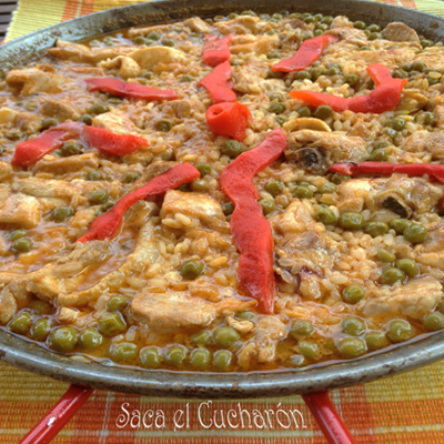 Ponemos la paellera en el fuego y derretimos la manteca de cerdo. Freímos en ella el pollo y el cerdo. Cuando hayan cogido color, añadimos la cebolla y sofreímos. Después agregamos el pimentón, removemos y seguidamente incorporamos el tomate triturado. Dejamos que todo se mezcle y se rehogue unos minutos, y ponemos los guisantes.