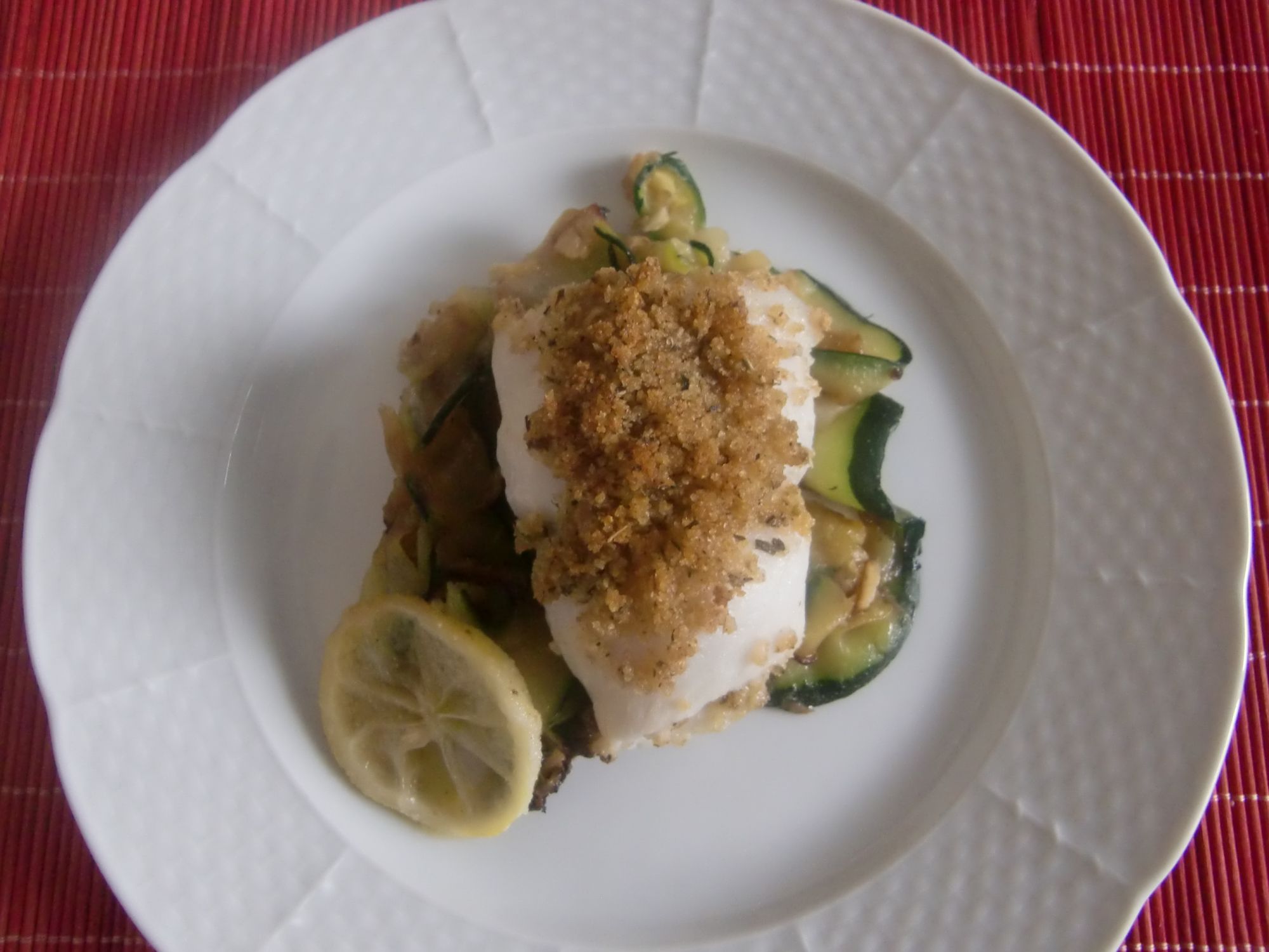 Mientras el pescado está en el horno, lavamos bien el calabacín y lo partimos en tiras muy finitas (podéis hacerlo con un pelador o con una mandolina) y lo doramos junto con los ajos (pasados por el mortero) en una sartén con aceite, hasta que estén blanditos y doraditos (suele salir un olor dulzón, cuando el calabacín está en su punto). Salpimentamos.