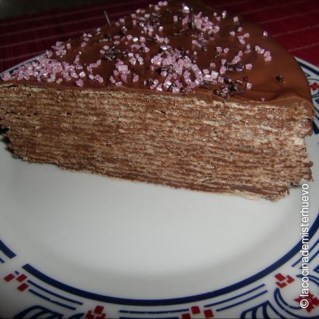 Vamos alternando capas de oblea y crema de cacao hasta llegar a la última capa, en la que cubriremos por completo toda la tarta con la crema de cacao.