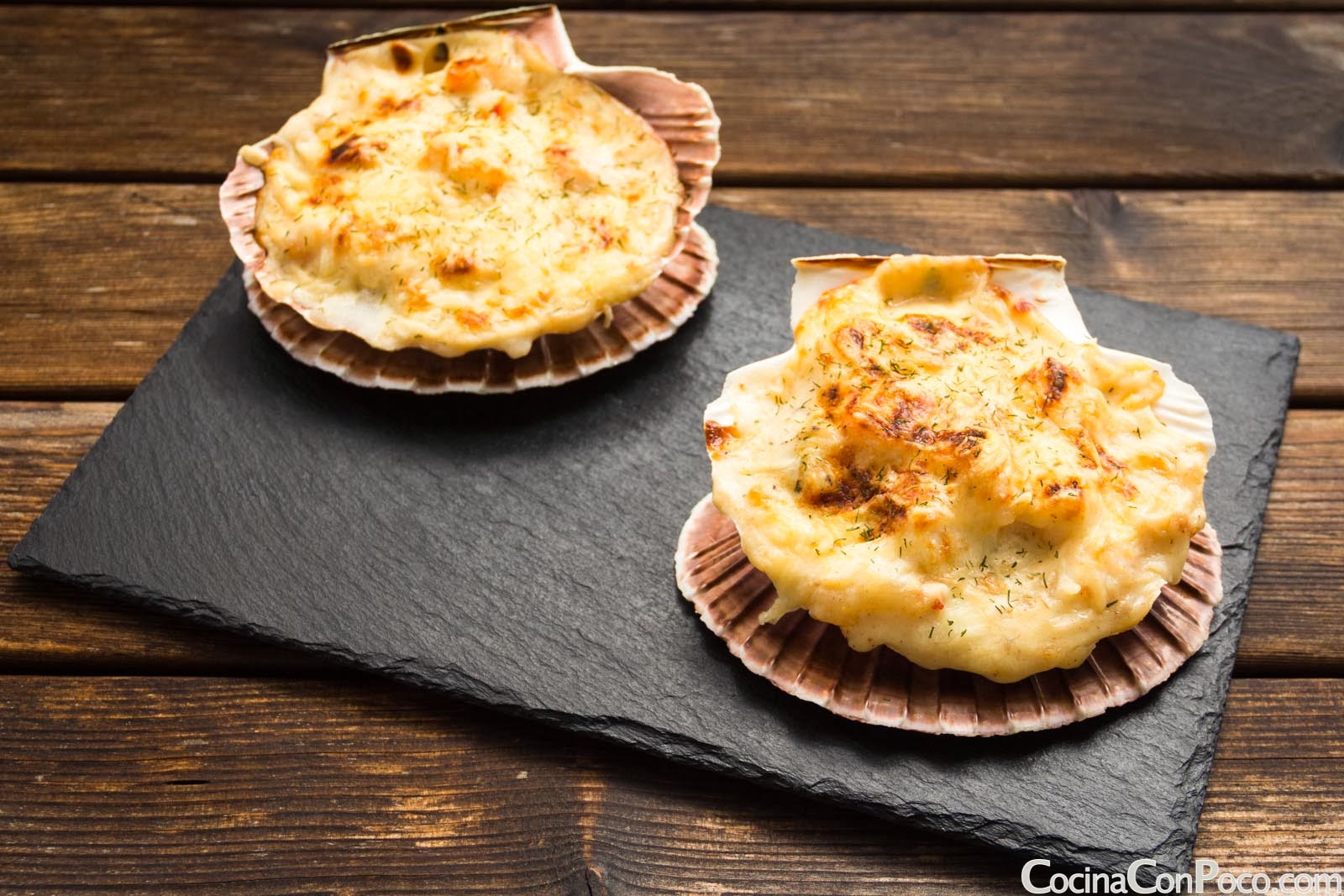 Se rellenan las vieiras y se echan un poco de pan rayado por encima y al horno hasta que se dore.