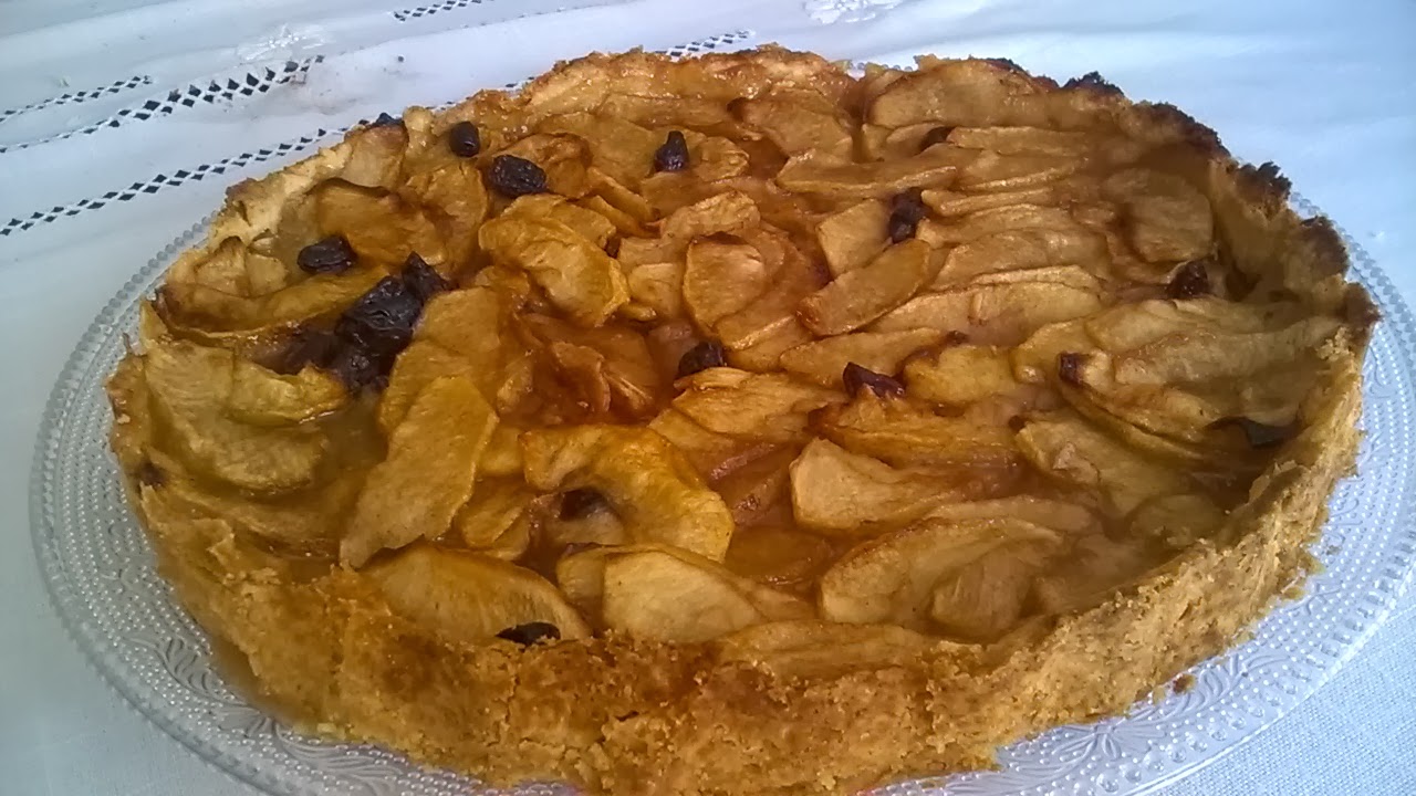 Tarta en masa quebrada con relleno de manzanas, pasas y canela