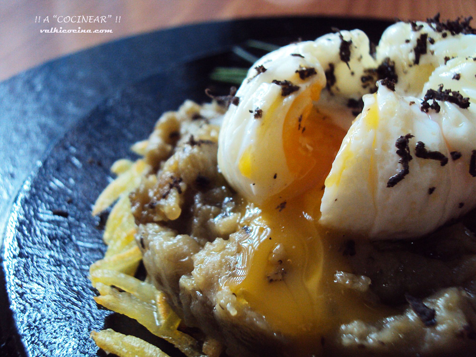BERENJENAS REHOGADAS CON HUEVO POCHÉ SOBRE CRUJIENTE DE PATATA ...