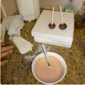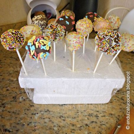 CUANDO VEAMOS QUE EL PALO YA ESTÁ PEGADO A LA BOLA DE BIZCOCHO, LO BAÑAMOS EN EL CHOCOLATE.
