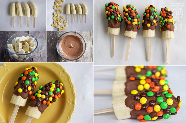 Pelamos los plátanos los cortamos por la mitad, los pinchamos unos palos planos como polos.
