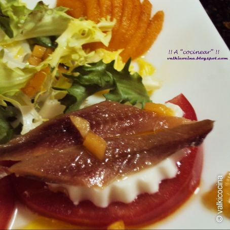 Ensalada de queso burgos y anchoas con vinagreta de fruta