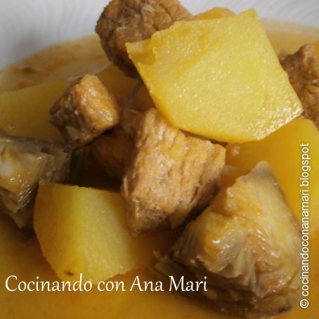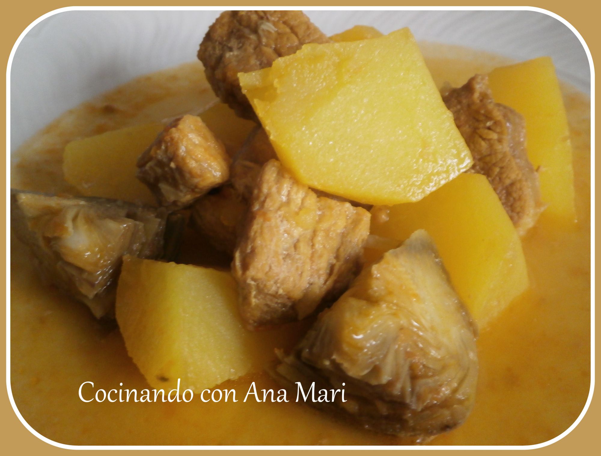 Ponemos el aceite, la ternera, la cebolla y los tomates rayados y la cabeza de ajos entera, todo en crudo después la sal y el vino blanco con el azafrán en hebra, lo ponemos a cocer durante 45 minutos,cuando se quede la salsa reducida le añadimos las patatas y las alcachofas cubriéndolas de agua y las dejamos otra hora hasta que estén blandas se apartan y listas.