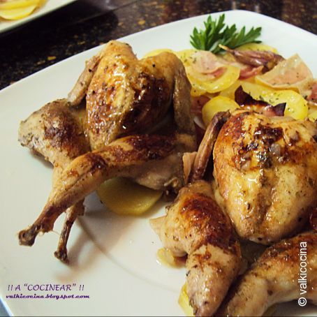 Coloca encima las codornices. y vierte: medio vaso de vino blanco, aceite, tomillo y orégano.