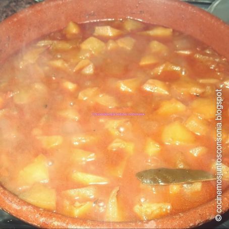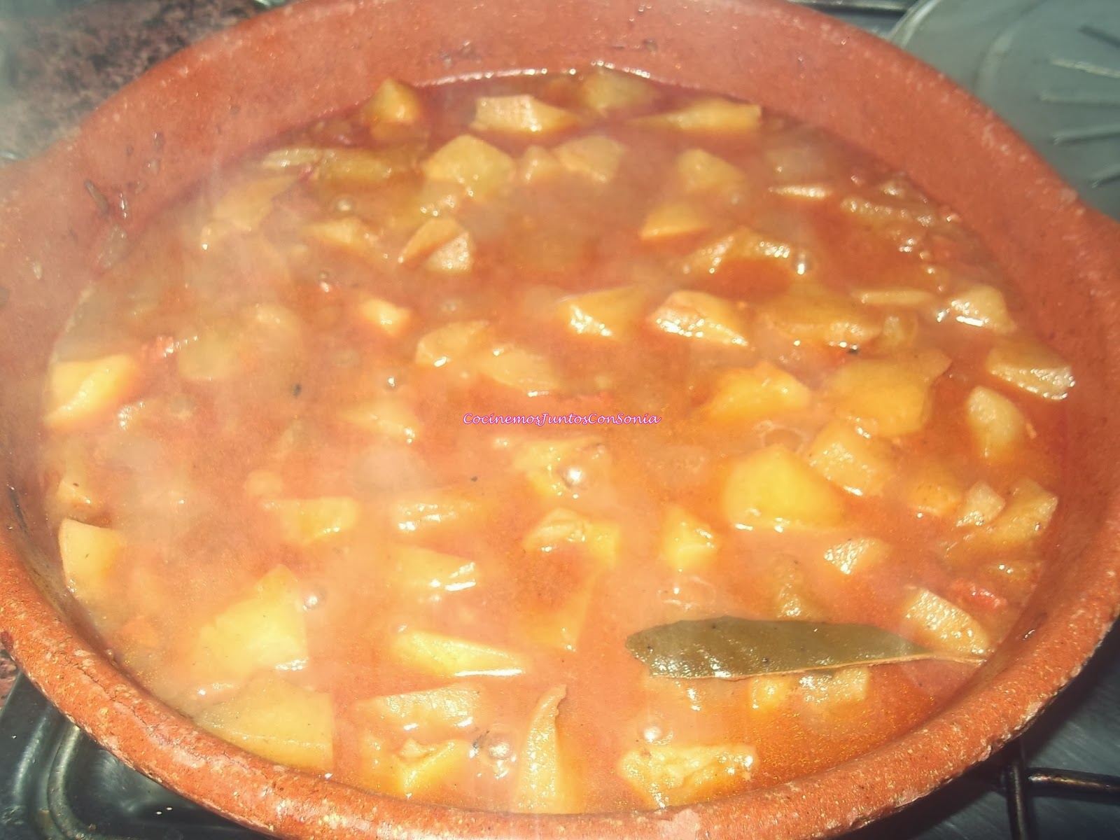 A continuación añadimos las patatas (las cuales habremos partido haciendo craquear para que suelten el almidón, y lograr que se nos espese el caldo)