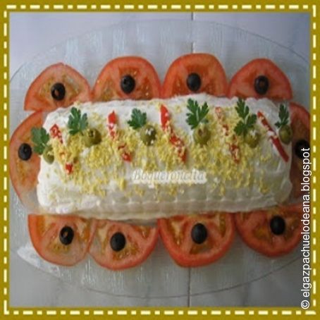 Una vez que lo sacamos lo adornamos con los 70 grs de mayonesa, yo usé una espátula para alisarla, el mediio huevo lo rallamos, partimos las aceitunas y el pimiento morrón a tiras. Y si se quiere un tomate a rodajas por alrededor, pero la decoración es al gusto.