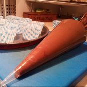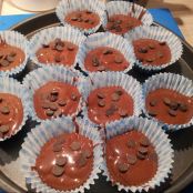 Pasamos a rellenar los moldes de magdalenas hasta los 3/4 y para terminar le añadimos unas gotitas de chocolate por encima. Para evitar el caos en la cocina es recomendable rellenar los moldes con una manga pastelera.