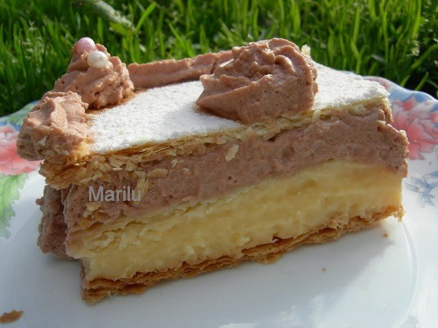 Para montar la tarta, colocamos una lámina de hojaldre, ponemos la crema pastelera, encima otra lámina de hojaldre, la crema de trufa, y terminamos con la última lámina de hojaldre.