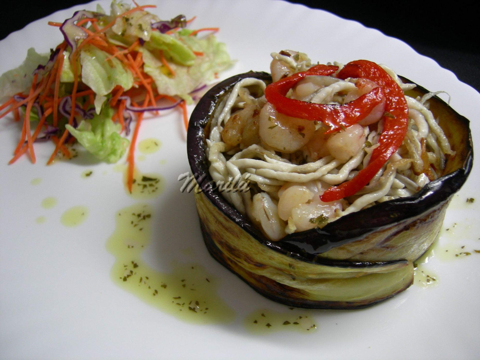 Lavamos las berenjenas y las cortamos en láminas a lo largo.Las metemos en un poco de agua con sal, para quitarles el amargor. Mientras tanto hacemos las gulas y las gambas en una sartén con un poquito de aceite y un diente de ajo laminado.Cuando estén listas, las sacamos para un plato y reservamos.