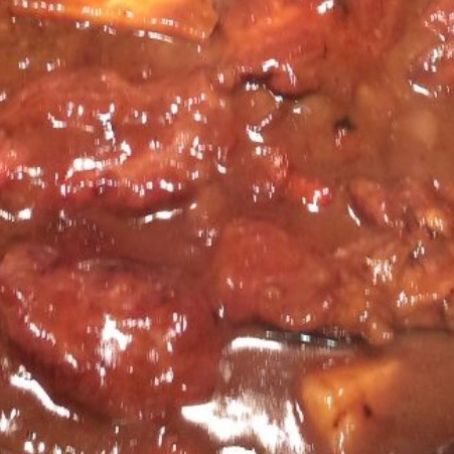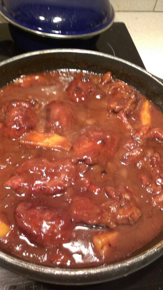 Carrilleras de cerdo con salsa hecha a base de mermelada hero de fresa, en mi casa se chupan los dedos y se acaba todo el pan!