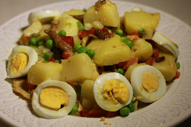 Cortamos una cebolla, un pimiento rojo, dos tomates grandes y un pimiento verde en daditos pequeños, echamos todos los ingredientes en un recipiente grande, pues ahí es donde vamos a mezclar nuestra ensalada campera. Añadimos un buen chorro de aceite de oliva y mezclamos para juntar sabores. Añadimos los guisantes y las patatas previamente cortadas en dados grandes. Añade el atún.