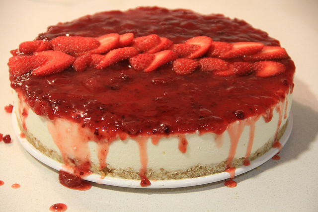 Echamos en un cazo la confitura o mermelada y 2 cucharadas de agua. Calentamos de manera suave hasta que se forme un sirope. Apartamos del fuego y en el mismo recipiente donde esta la tarta de queso ya fría echamos el sirope de manera homogénea (como está líquido es bastante fácil). Y otra vez a la nevera durante unas horas, debe estar muy fría para su degustación.