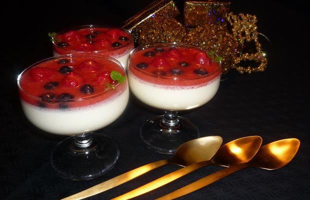 Panna Cotta de mermelada de frambuesa y arándanos.