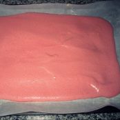 Cubrimos una bandeja apta para horno con papel de horno; lo untamos de mantequilla y lo espolvoreamos ligeramente con harina. Extendemos sobre el papel la masa, dándole forma rectangular y alisándola con una espátula. Lo metemos en el horno, previamente calentado, a una temperatura entre 160 y 170 grados, durante 12 minutos. Cuando haya transcurrido este tiempo lo sacamos y lo cubrimos con un paño húmedo durante unos minutos.