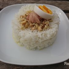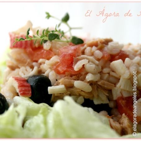 Montamos la ensalada poniendo una base de lechuga en la base y el arroz por encima.