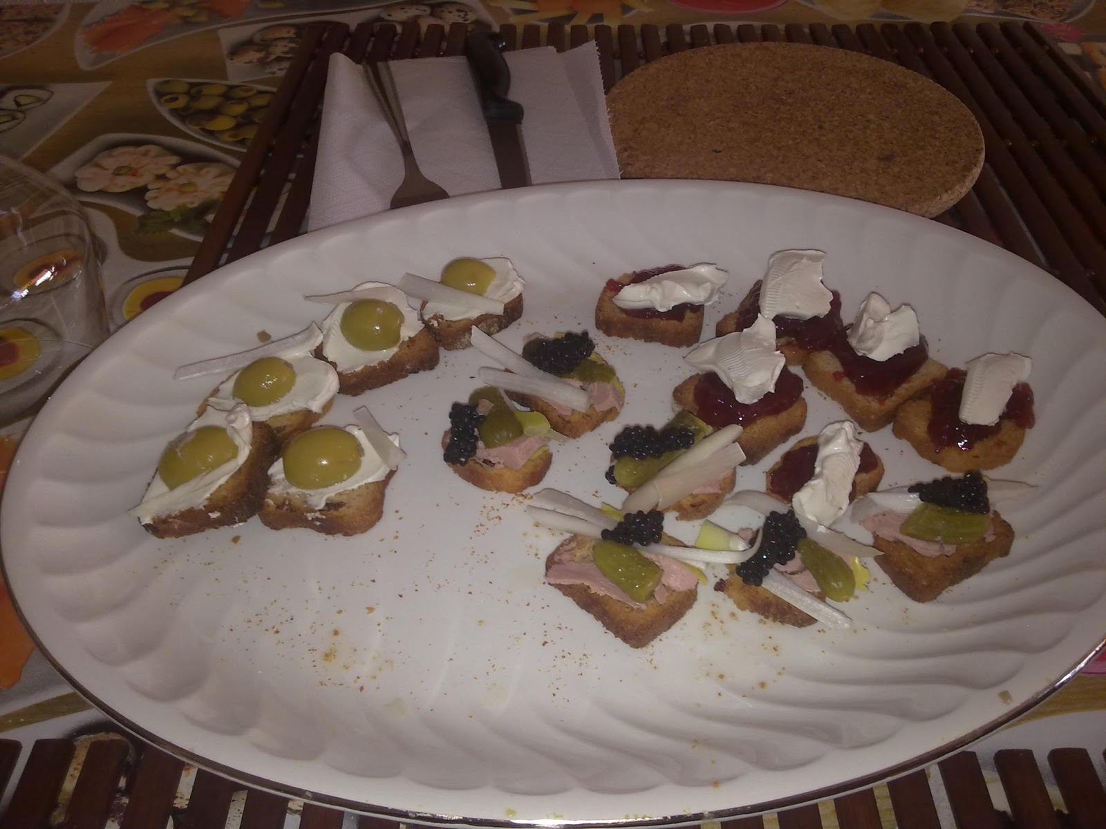 Prepara una bandeja donde colocarlos. Ahora coloca las tostaditas, y escoge 6 para hacerlas de la siguiente manera : untadas con el patê,encima colocamos un trozo de pepinillo en cada una , un poco de caviar, y un poco de cebolleta.