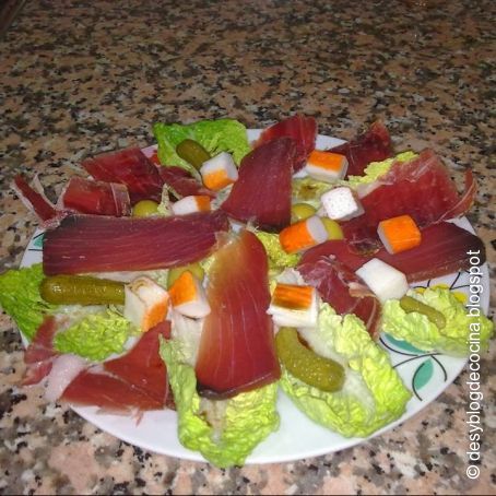 Esparcimos los pepinillos y el surimi y para terminar un poquito de vinagre de módena sobre las puntas delas hojas del cogollo. Listo para comer!!!