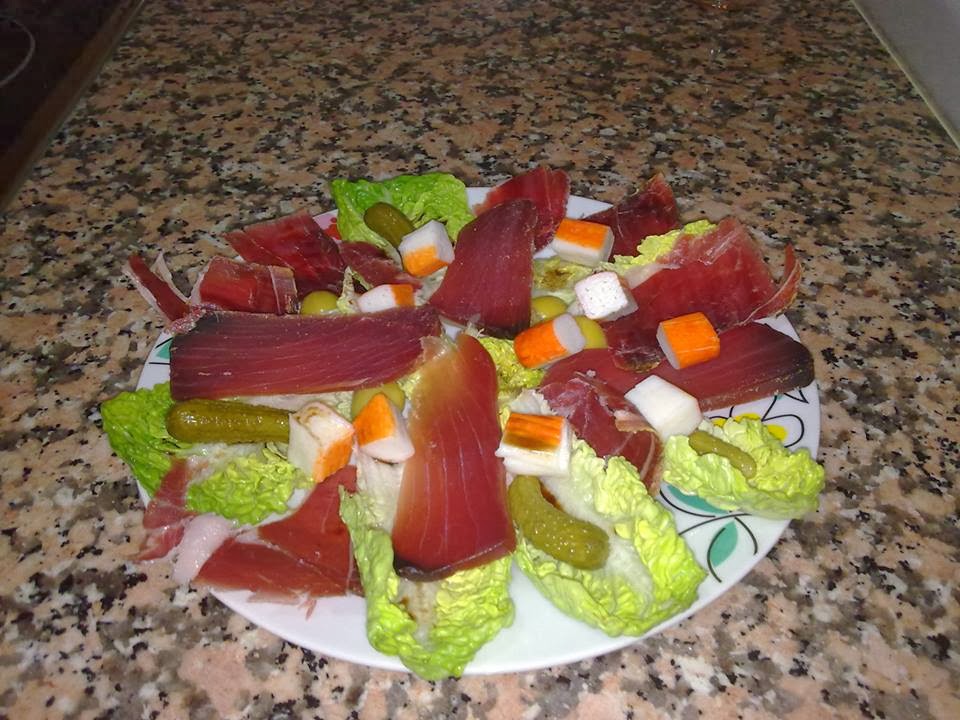 Colocamos las hojas del cogollo bien repartidas por el plato (como se ve en la imagen), encima colocamos el jamón bien repartido y la mojama