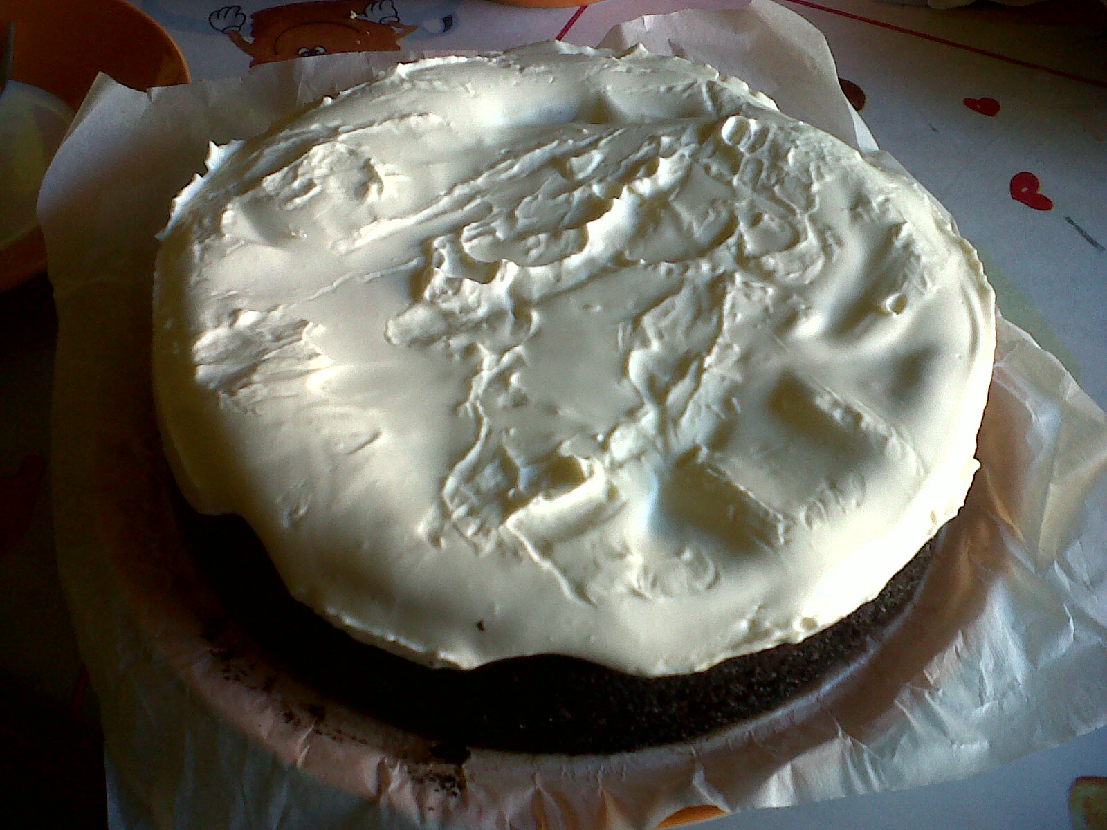 Pon una capa generosa sobre la tarta simulando la espuma de la cerveza.Deja que caiga un poco por los laterales de la tarta.