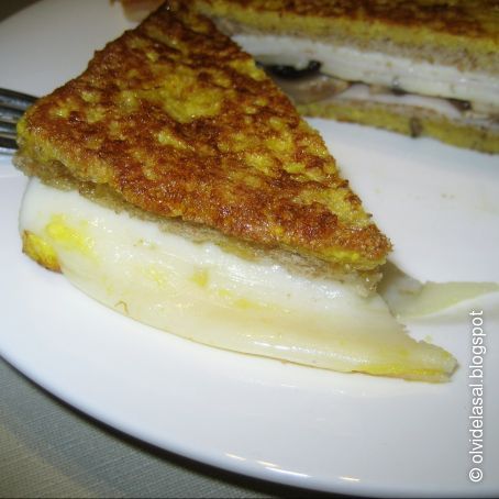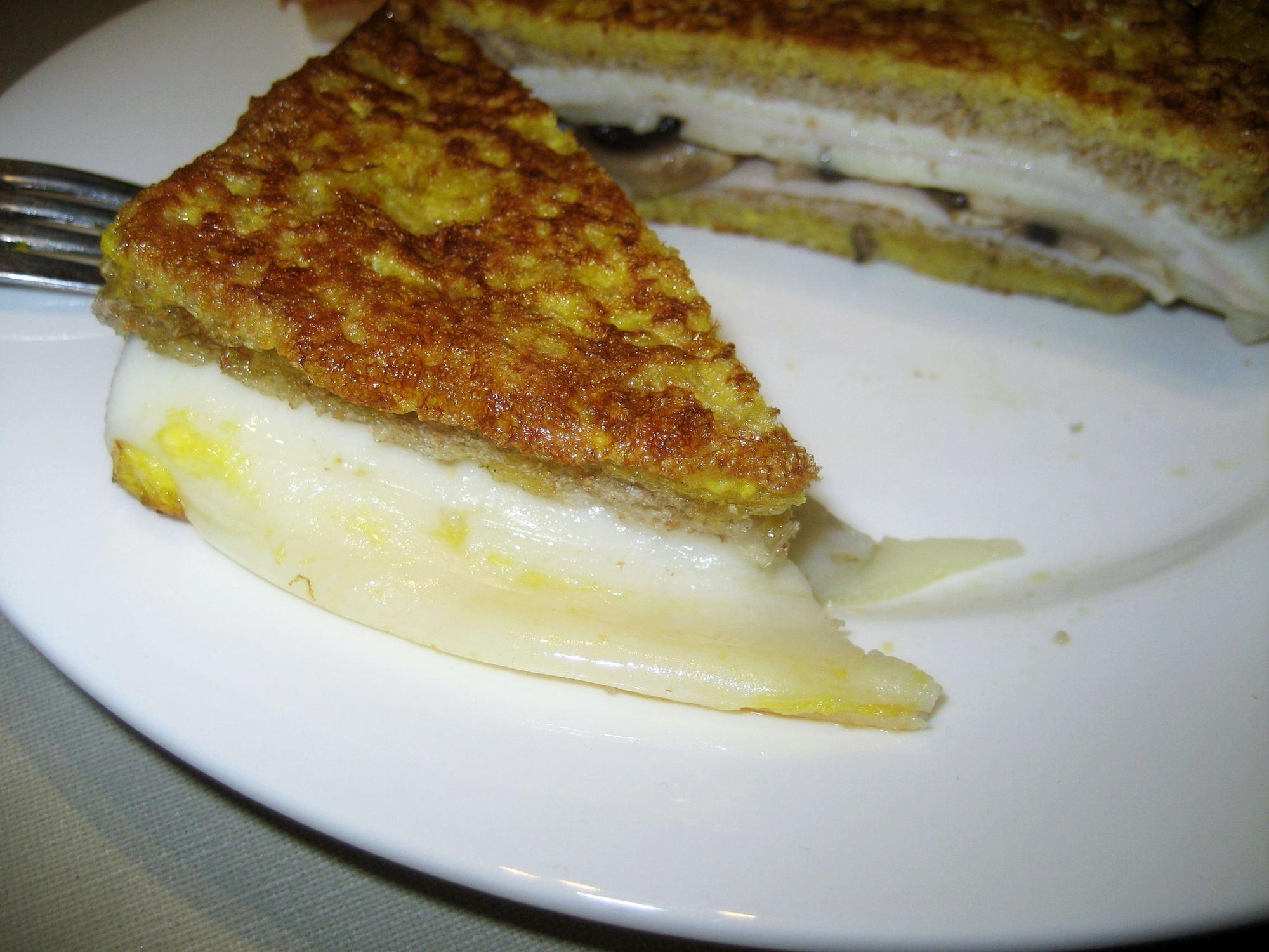 Sándwich mixto relleno de champiñones rebozado con huevo y calentado en la sartén.