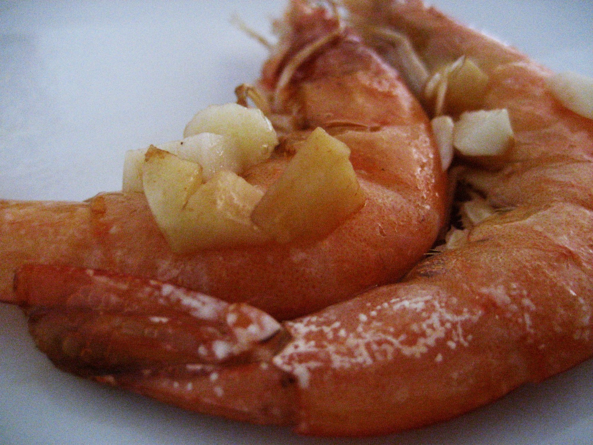 A continuación, los retiramos hacia un lado de la sartén para evitar que se quemen y entonces ponemos los langostinos repartidos. Dejamos que su color cambie a anaranjado por un lado y después por el otro.