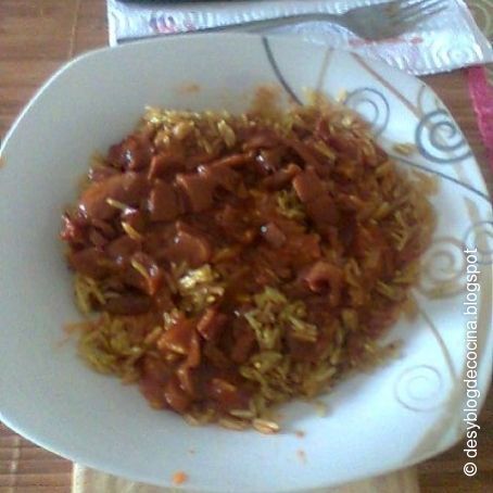 A continuación, cuando estén casi hechos incorporamos el tomate frito, pimienta molida y la guindilla. Removemos bien para que se mezclen los sabores. Para terminar añadimos el árroz basmati.